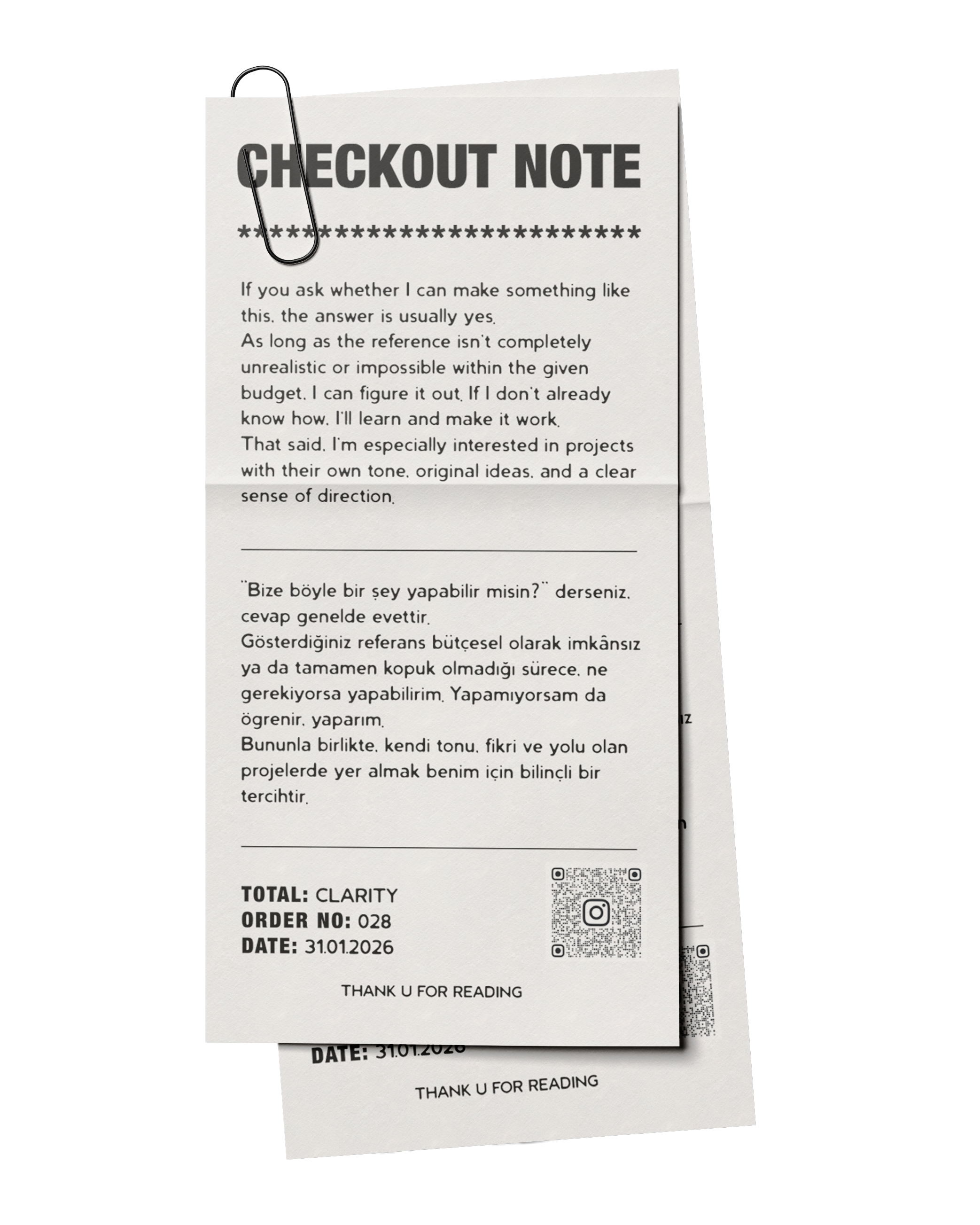 Bu odaklı çalışmaların yanında, sistemlerin, anlatıların ve görsel dillerin daha derinlemesine ele alındığı kapsamlı projeler de geliştiriyorum. Ölçek ne olursa olsun, ilgimi çeken şey hep aynı: açıklık, yapı ve nihai sonucu sessizce şekillendiren kararlar.
